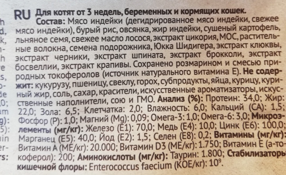 Рассмотрим состав корма One&Only на примере варианта «Kitten, Индейка с рисом» (для котят от 3 недель, беременных и кормящих кошек):