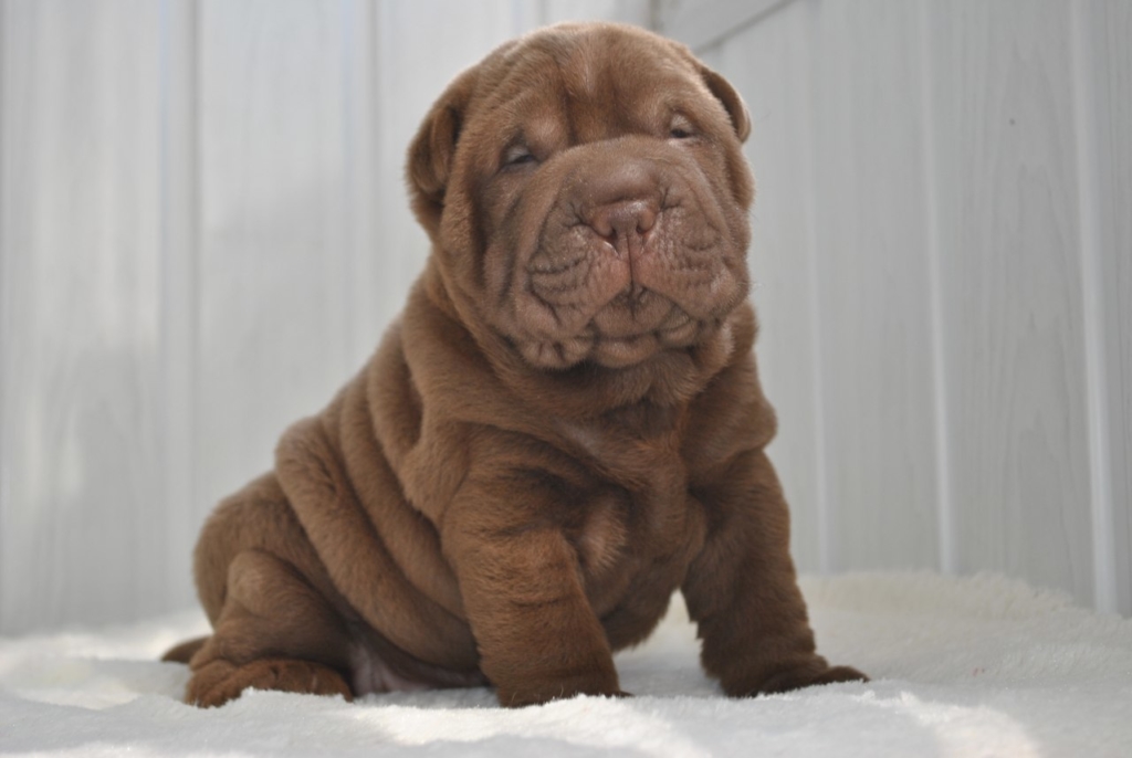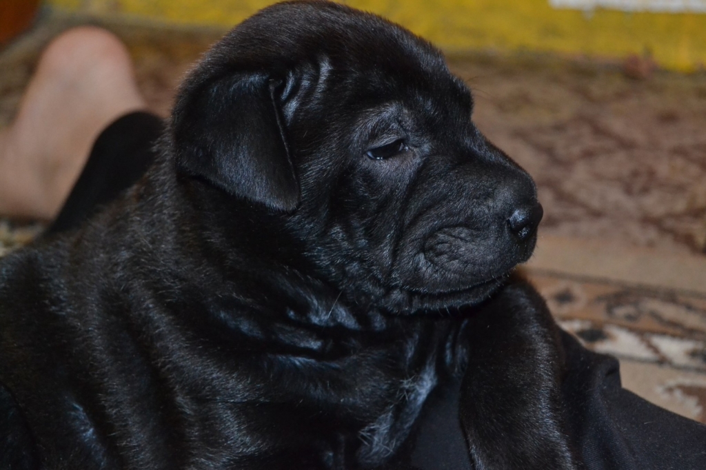 Шкурка шарпея растет неравномерно. При рождении складок нет совсем, а к полутора месяцам – возрасту, когда малышей забирают в семьи – их становится слишком много. С ростом складчатость уменьшается. Предсказать на 100%, насколько складчатый будет конкретный щенок – невозможно, но можно лишь примерно предполагать, глядя на их родителей.