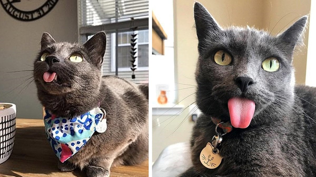 Возможно, у вашего котика неправильный прикус и тогда очень важно следить за питьём кошки, ведь допустить пересыхания тканей кончика языка нельзя