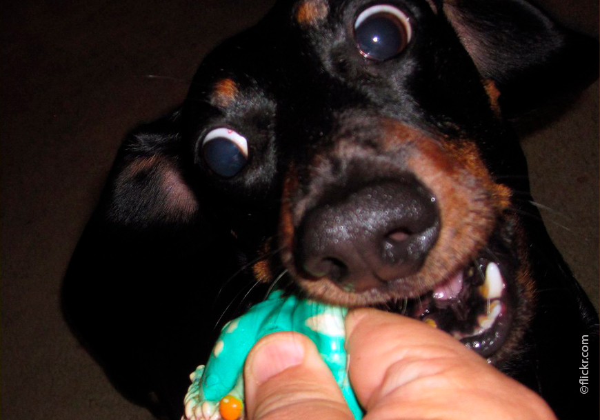 - Неправильное поведение хозяина во время игры с собакой или в процессе ее дрессировки. При взаимодействии с собакой нужно использовать игрушки или специальные предметы, но не свои руки или ноги. Кроме того, в процессе игры нужно стараться не провоцировать питомца на то, чтобы он вас кусал. Если вы видите, что ваша собака прижала к голове уши, начала показывать свой оскал – это значит, что все происходящее вокруг она уже не воспринимает, как игру и начинает агрессивно вас атаковать. В таком случае требуется немедленно прекратить игру или обучение и выйти из контакта с животным.