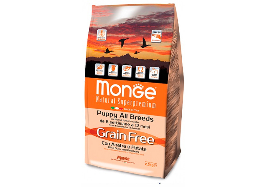 Среди сухих формул у Monge отдельно идёт линейка беззерновых кормов и диет, которые по составу максимально приближены к натуральному рациону: