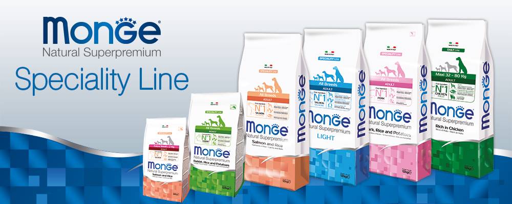Продукция «Monge» производится с соблюдением всех требований к качеству продукта и его компонентов. «Monge» — это полноценная линейка кормов, учитывающая вес, возраст и диетологические потребности животного.
