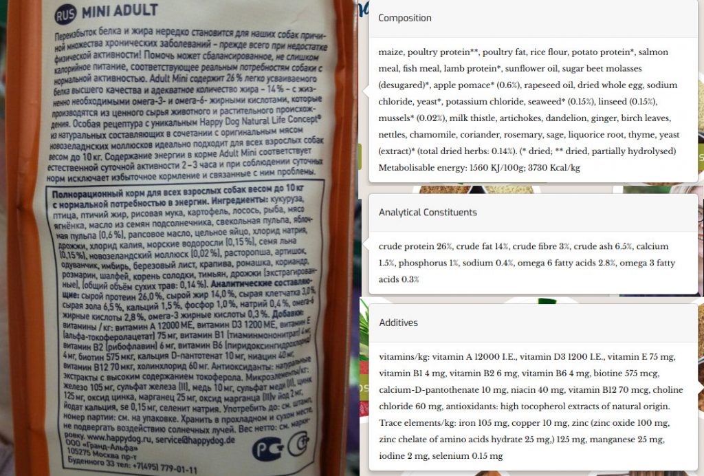 Рассмотрим состав корма Happy Dog на примере варианта Mini Adult (для взрослых собак мелких пород). Посмотреть этот состав можно на изображении ниже (кликните по нему чтобы увеличить для удобности чтения):