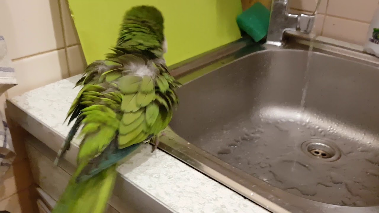 - Самостоятельно. В таком случае необходимо взять пернатого в руки и подставить под воду, включив перед кран. Монаху требуется дать возможность самому понять, что в льющейся струе нет ничего страшного. В таком случае питомец будет стараться запрыгивать под воду сразу после открытия крана с водой.