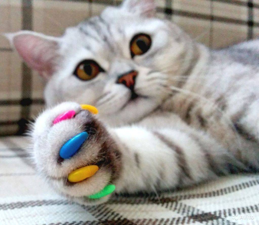 В зоомагазине покупают специальные накладки на когти. Эти штучки крепятся на верхнюю часть когтя на клей и отваливаются вместе с ней примерно раз в месяц. Накладные когти безвредны для кошек и не мешают свободно втягивать когти. Обычно они имеют яркую расцветку и специальный клей в комплекте.