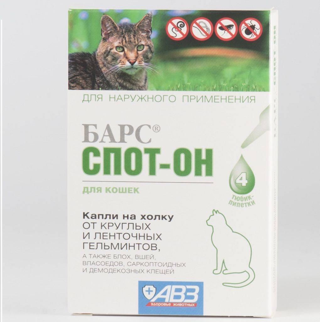 - Барс спот-он. В составе средства имеется празиквантел, ивермектин и вспомогательные вещества. В упаковке 4 пипетки. Капли разрешены к применению котятам, достигшим двухмесячного возраста.
