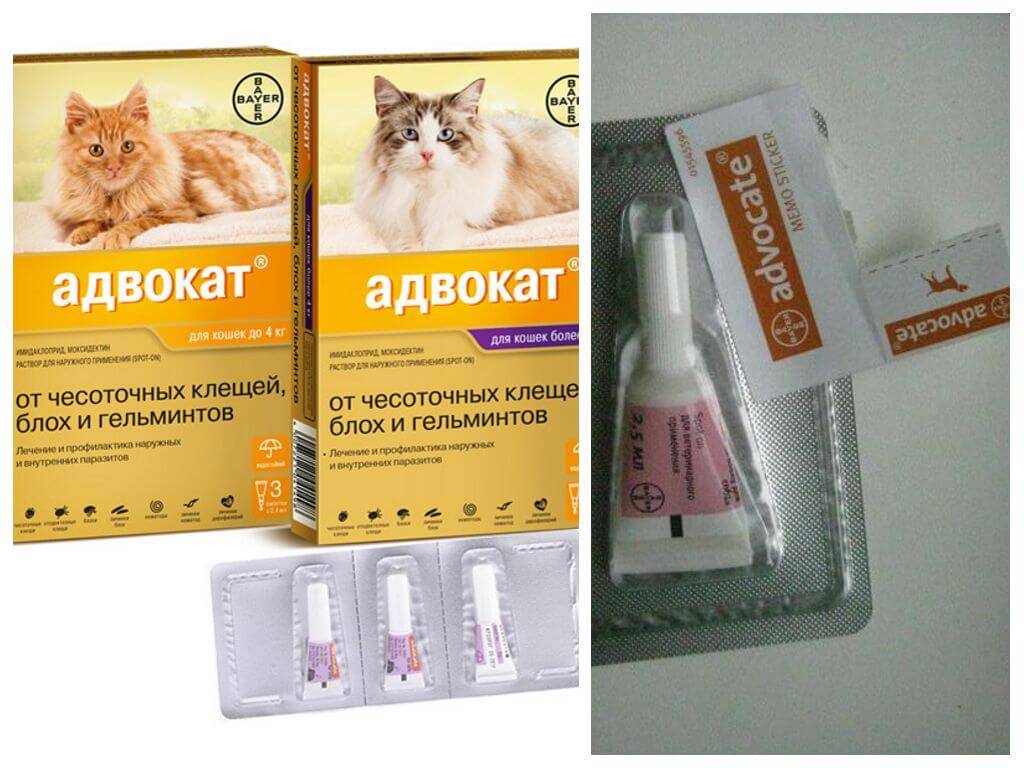 - Адвокат. Этот эффективный препарат содержит имидаклоприд и моксидектин. Не рекомендуется использовать в терапии котят, возраст которых не достиг 9 недель, а также кошек, которые весят менее 1 кг.