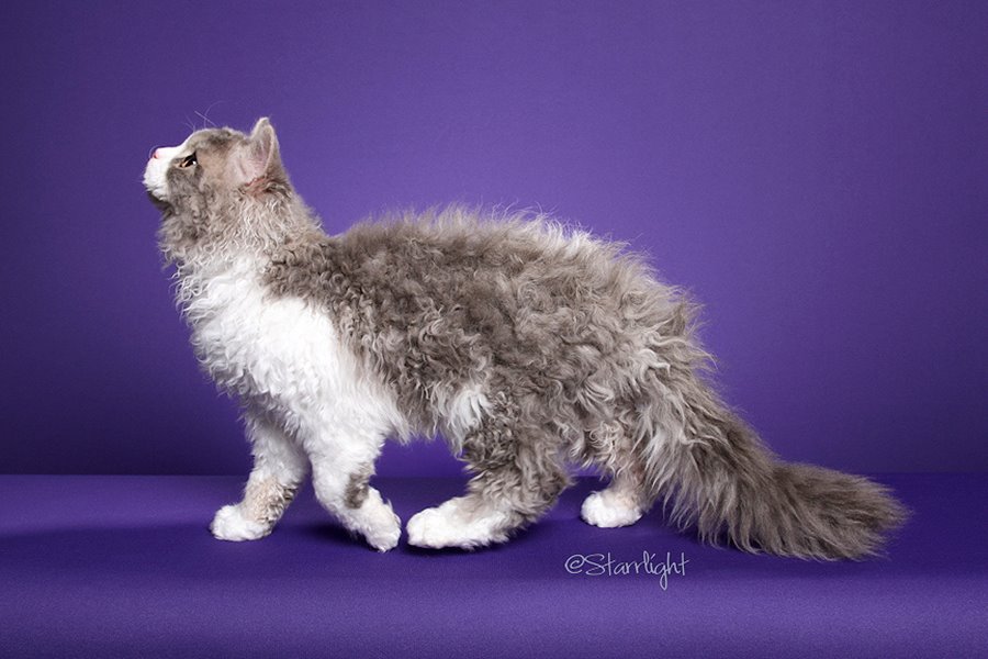 | Селкирк-рекс (Selkirk Rex ) | Одна из самых популярных разновидностей, шерсть которой напоминает шкуру ягненка, появилась в 1987 году в США естественным путем. У обычной кошки родился котенок с волнистой шерсткой и закрученными усиками. В дальнейшем после экспериментов по скрещиванию кудрявой кошки с британской, персидской и другими не менее известными породами удалось закрепить ген, который отвечает за «овечий» волосяной покров. Селкирки могут быть как длинношерстными, так и короткошерстными, а степень волнистости шерсти зависит от множества факторов начиная от климата и кончая здоровьем животного. Порода отличается спокойным, добрым нравом и бесконфликтностью поведения | |
