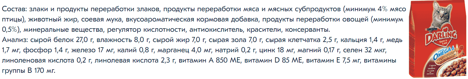 Пример состава корма Darling для кошек с мясом и овощами
