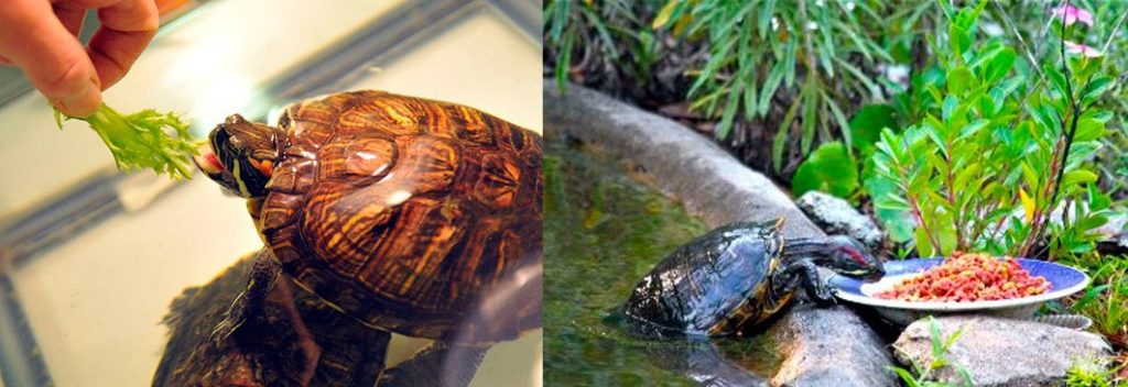 Маленьких красноухих черепах кормят каждый день. В их рационе должна преобладать белковая пища. По достижению возраста 2-х лет в рацион постепенно можно вводить растительную пищу и переводить питомца на кормление в количестве 2-3 раз в неделю. Помимо основной пищи черепахам необходим постоянный источник кальция – измельчённая яичная скорлупа, костная мука.