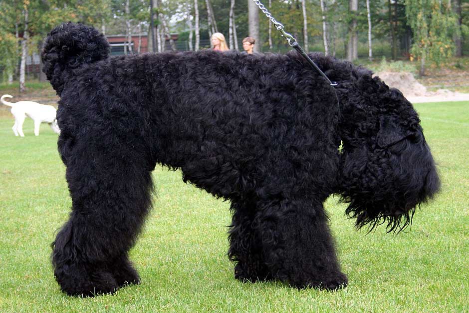 Как уже было сказано, черный русский терьер – это результат смешения разных пород. Внешне он больше всего напоминает ризеншнауцера, но только обросшего длинной, как у ньюфаундленда, шерстью, которая к тому же волнистая и чуть мягче, чем у ризена.