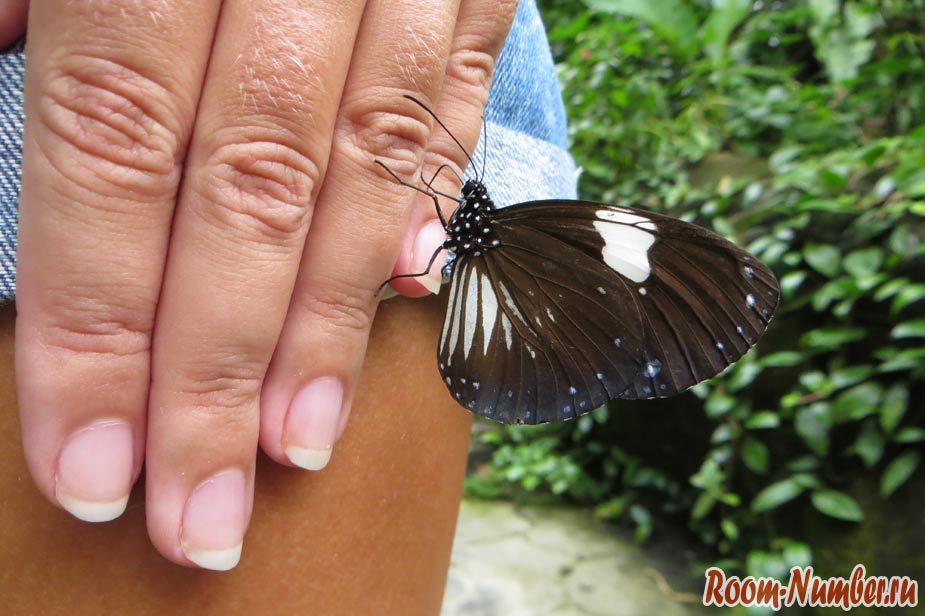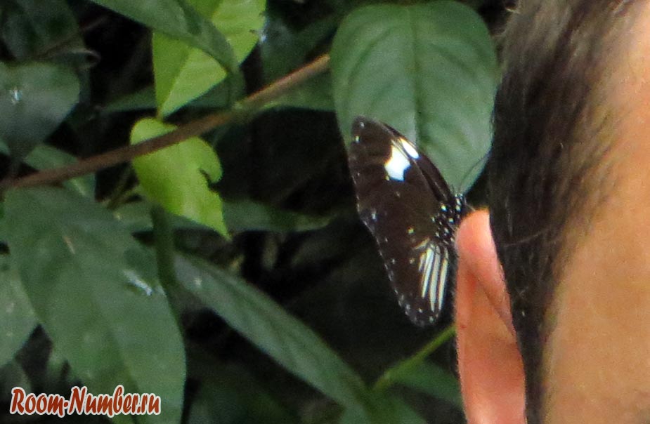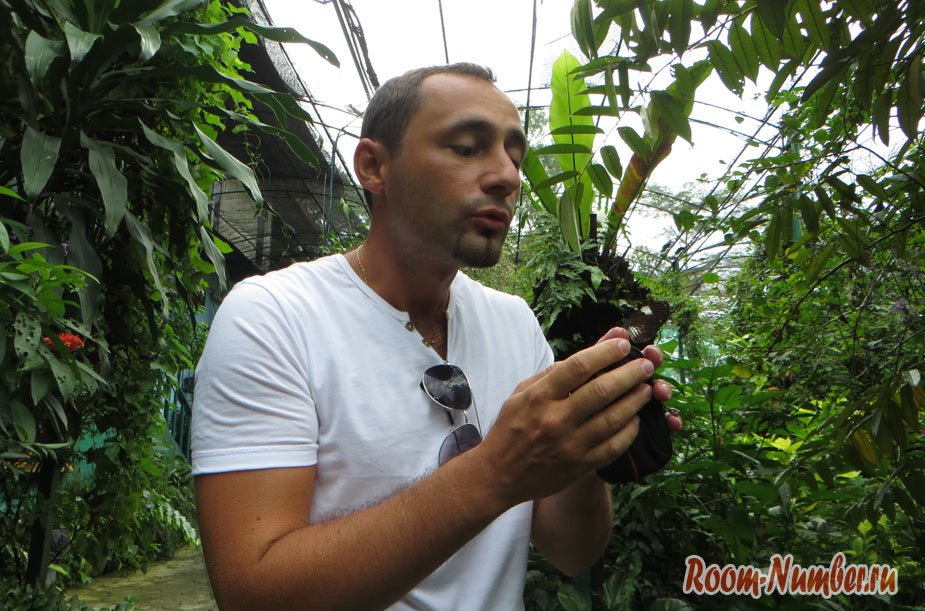 Трогать бабочек самостоятельно запрещено, и тем более за крылья. Если хотите взять бабочку на руку или посадить на другую часть тела, то можно попросить персонал. Фото с бабочками получаются великолепные. Услуги персонала по общению с бабочками включены в стоимость билета.