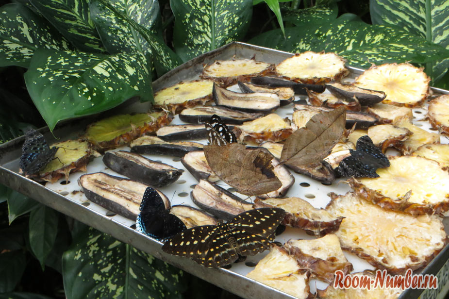 Сразу много бабочек в одном месте можно увидеть в их столовой, где на обед у них ананасы