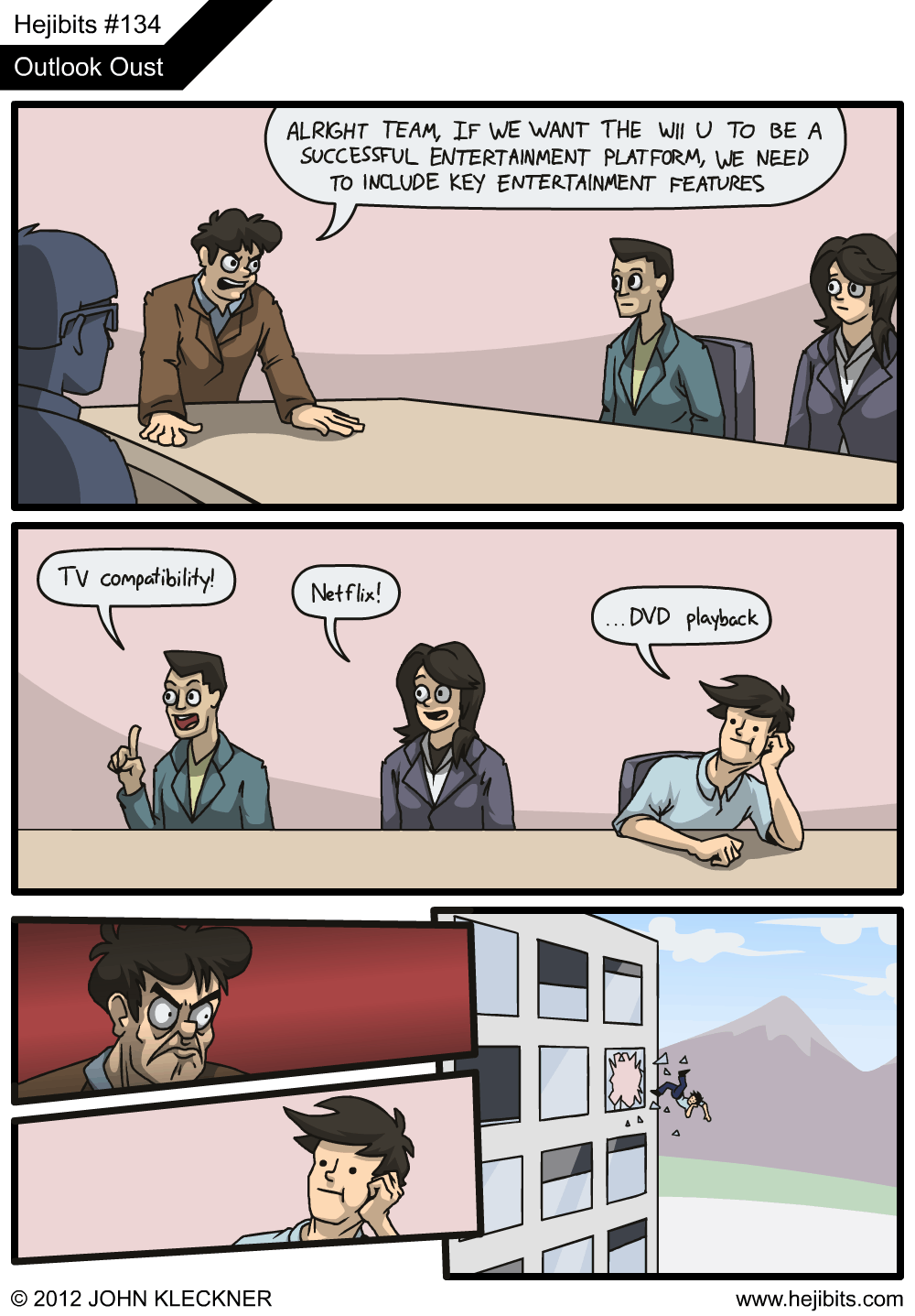 В оригинальном комиксе показано совещание сотрудников компании Nintendo. Они обсуждали внедрение новых функций в игровую консоль Wii U. Совместимость с телевизором и сотрудничество с Netflix были хорошими идеями, а вот совместимость с оставшимися в прошлом DVD-плеерами — нелепой. За это скучающий молодой человек и поплатился.