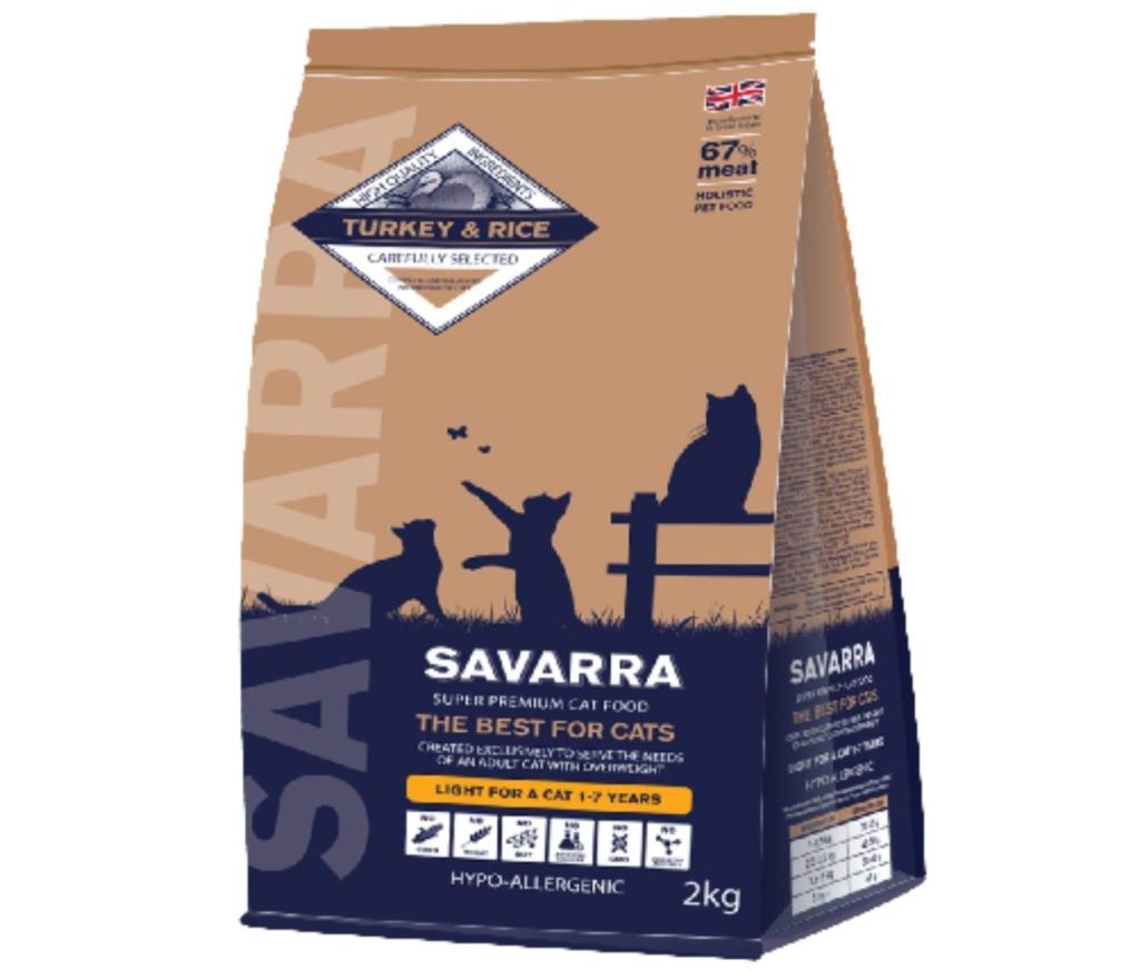 - Savarra Light/Sterilized Cat (для кошек, имеющих избыточный вес и стерилизованных). 67% в нем — мясные ингредиенты. Основа корма — нежное диетическое мясо индейки, полезное в первую очередь из-за большого количества витаминов Е и А, а также натрия, который обеспечивает нормализацию обмена веществ. Благодаря добавлению в продукт L-карнитина оптимизируется жировой обмен и, как следствие, постепенно уходит лишний вес.