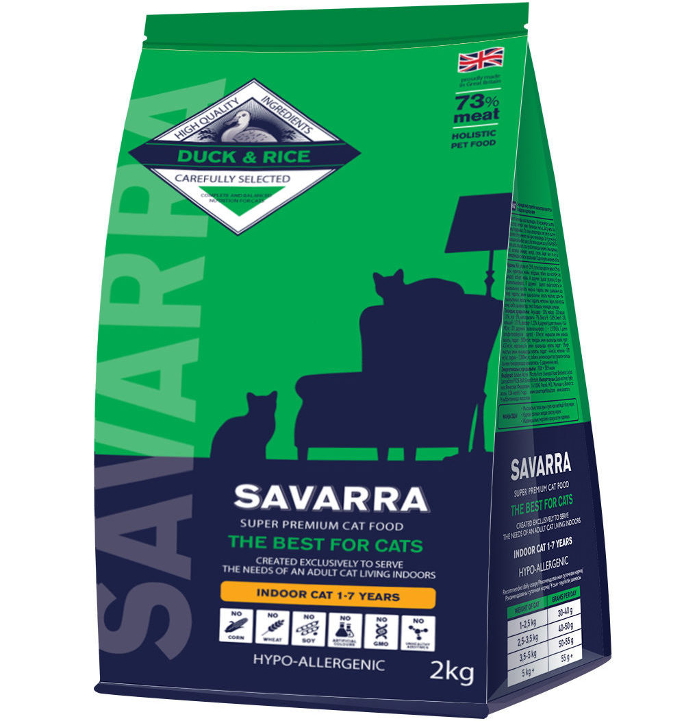- Savarra Indoor Cat (для кошек, живущих в помещении, без выгула). В рационе 73% составляет мясо утки. В утином мясе много ненасыщенных жирных кислот, поддерживающих деятельность сердечно-сосудистой системы и работу мозга. Витамин А нормализует состояние кожи и шерстяного покрова, а кроме того улучшает зрение.