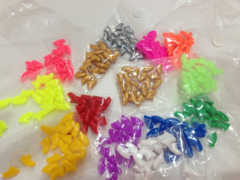 Большое разнообразие ассортимента позволяет выбрать антицарапки любого цвета. Для особей женского пола хозяева чаще выбирают цветные накладки, для котов больше подходят прозрачные или строгие неброские модели. Есть люминесцентные колпачки, которые светятся в темноте и даже гламурные — с блёстками и декоративными вкраплениями. Если в доме маленький ребёнок, то лучше выбирать накладки яркого цвета. Так гораздо проще отследить, не слетели ли они с когтей кошки.