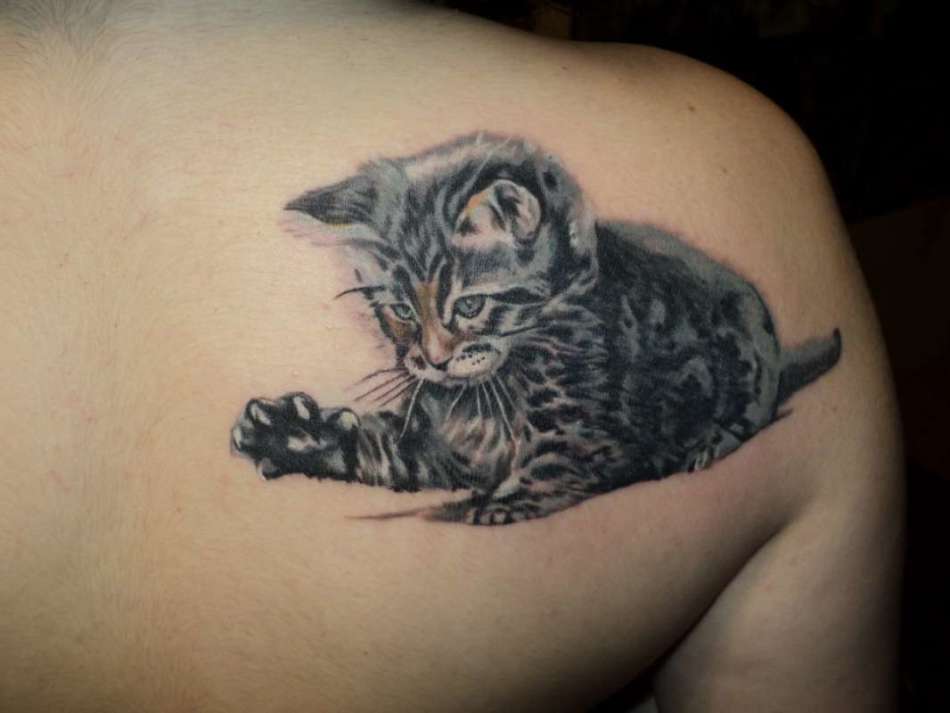 Маленький котенок — символизирует нежность, пробуждает воспоминания о славных детских годах. Чаще всего такие эскизы выбирают девушки, мало того, что татуировка украшает тело, еще она подчеркивает то, что обладательница тату добрая, трогательная натура.
