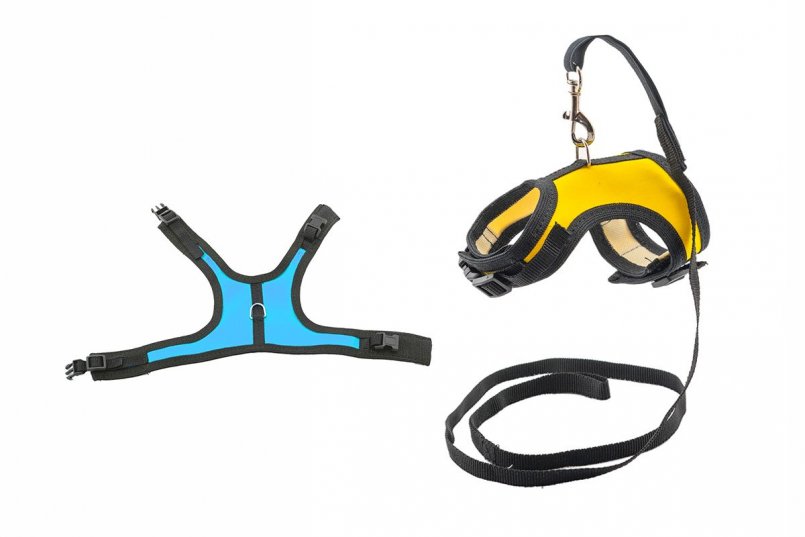 - Проверьте, ничего ли вы не перекрутили и всё ли надежно застегнуто. Убедитесь, что шлейка не давит на кожу питомца, и при необходимости отрегулируйте ремешки.
