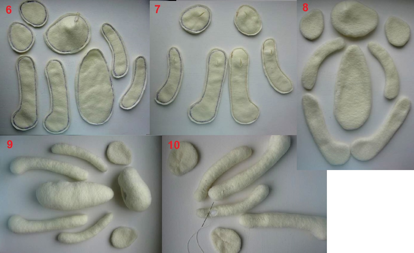 Заполняем каждую деталь синтепоном или другим наполнителем, равномерно распределяя его внутри при помощи карандаша, и зашиваем вручную сделанные отверстия.