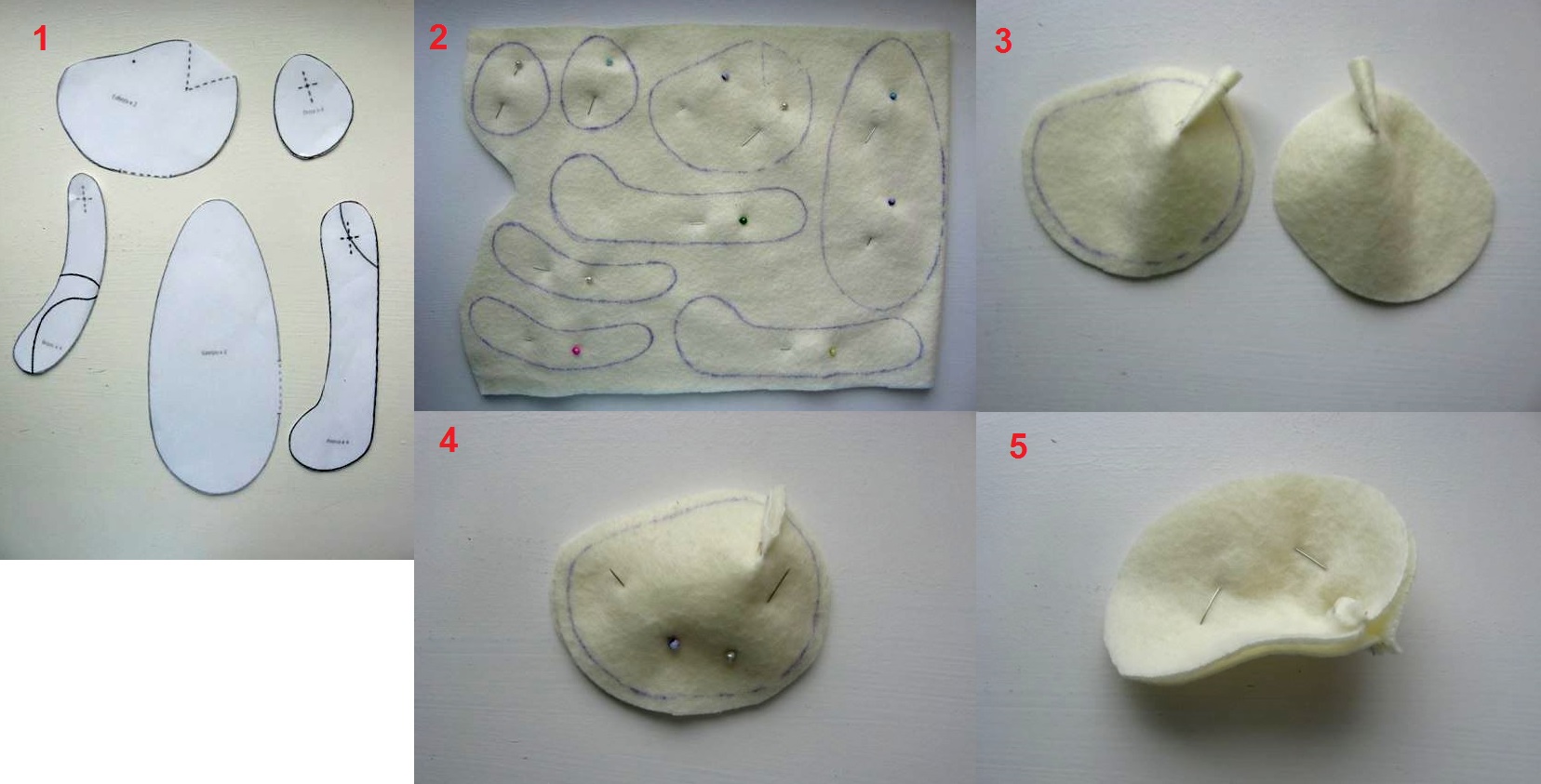 Вырезаем деталь для будущей головы и сначала прострачиваем места вытачек, а затем скалываем обе ее части лицевой стороной друг к другу и прострачиваем по периметру.