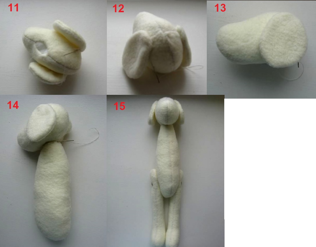 Теперь начинаем соединять все части друг с другом. Сначала пришиваем ушки к голове, а затем сшиваем потайными стежками голову с туловищем, как показано на фото.