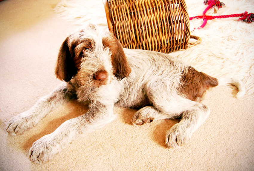 Шерсть у собачки средней длины, но теряет ее Итальянский спиноне много. Если вас не страшит, что она будет повсюду, можно брать этого красавца в дом. Просто во время линьки нужно немного больше времени, чтобы вычесывать питомца – хотя бы пару раз в неделю. Шерсть проволокообразная и грубая образует усы и бороду. Подшерсток у Спиноне отсутствует, но зато кожа очень толстая.