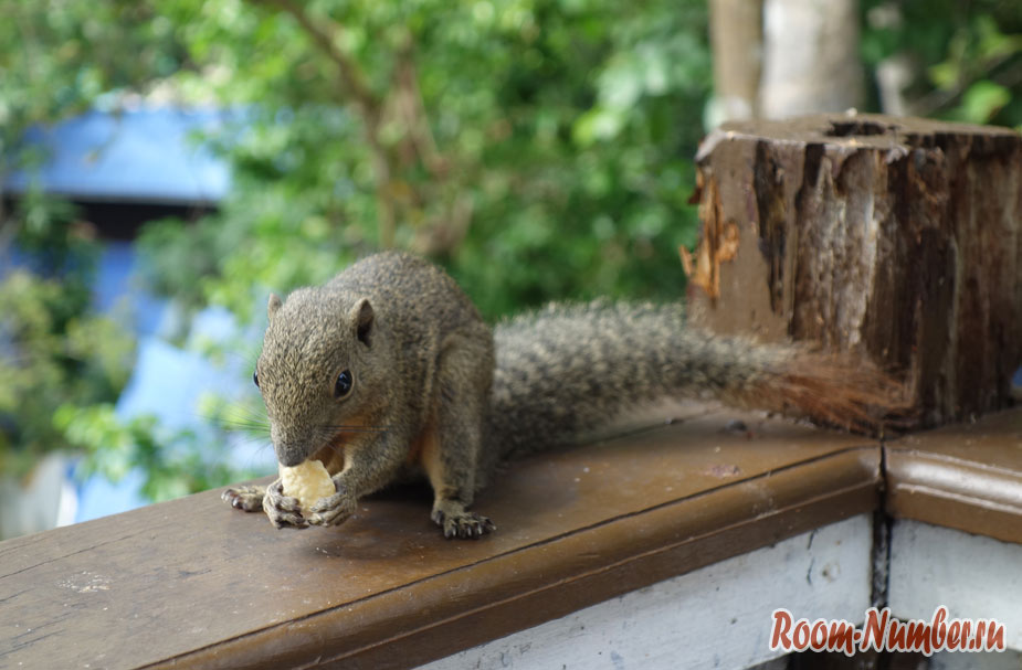 На острове белок множество. Ползают по деревьям, по крышам, по дорожкам, приходят в рестораны. По утрам любят приходить на веранду и клянчить что-нибудь пожевать. Мы покормили всеядных белочек чипсами.