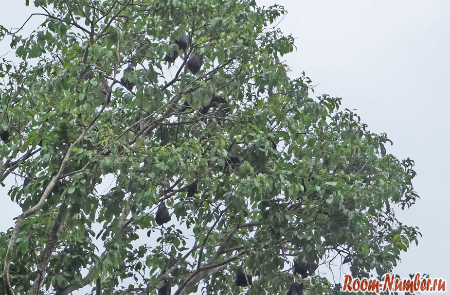 С ними мы уже сталкивались все в той же Шри Ланке, в городе Канди. На Перхентианах они так же висят стаями на деревьях прямо над отелями. Громко и противно пищат, особенно утром и вечером.