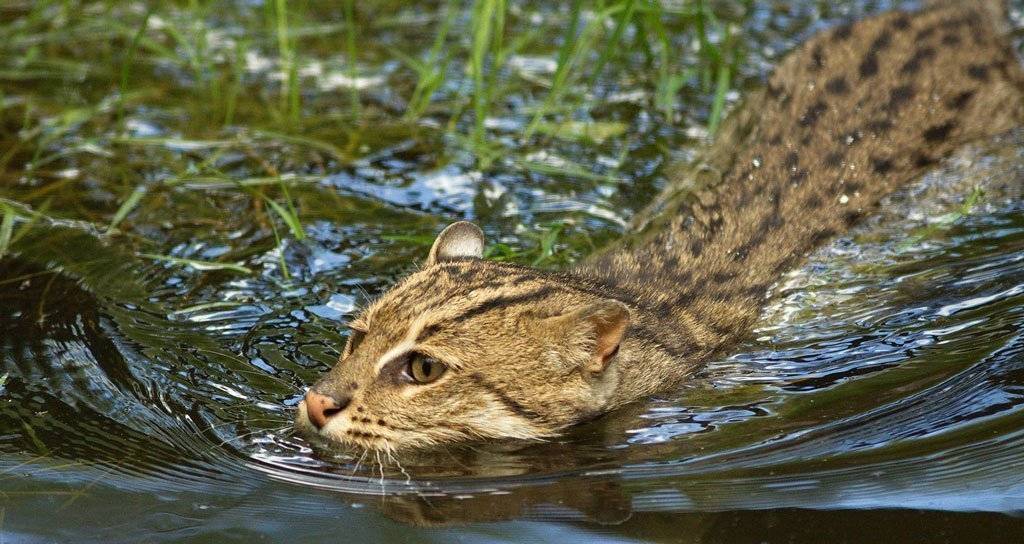 Очень необычно, что кот предпочитает болотистые местности и с охотой погружается в воду. Именно эти особенности в поведении обусловили тот факт, что животное достаточно активно и успешно охотиться не только за рыбой, но и за водными видами птиц. Для этого водяная кошка опускается полностью в воду. Ныряет и всплывает непосредственно под птицей, хватая ту острыми зубами и когтями.