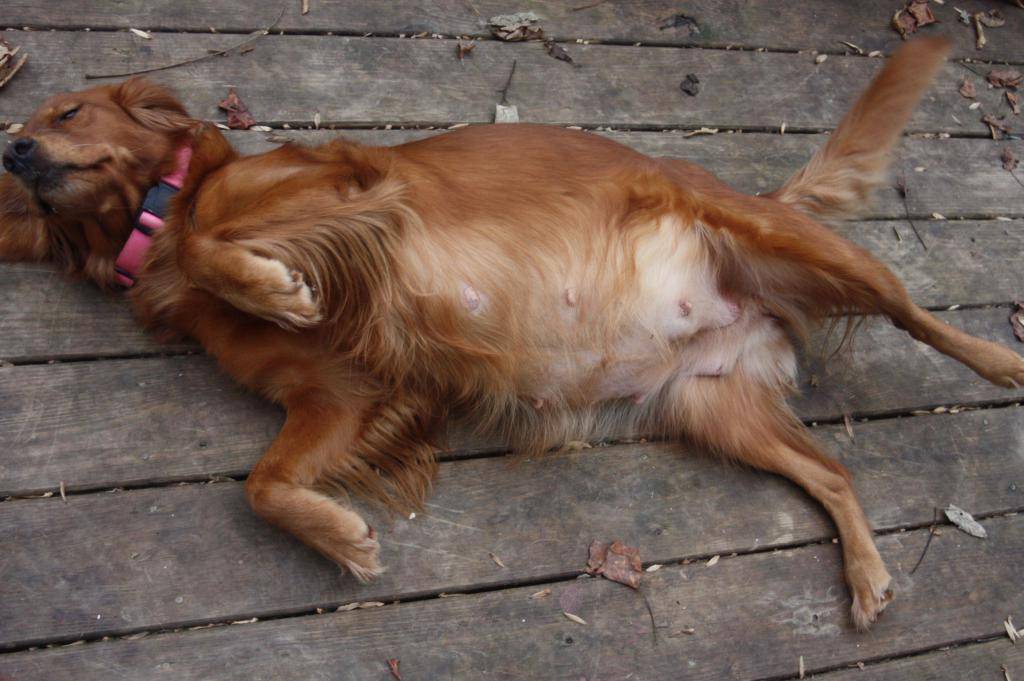 - Эструс. В этот период происходит овуляция. Вульва сильно набухает, выделения становятся менее жидкими, уменьшается их количество. Длительность этапа овуляции составляет 4–12 дней. При приближении кобеля, во время поглаживания крупа или при прикосновении к петле сука принимает характерную позу – слегка разводит задние конечности и отводит хвост.