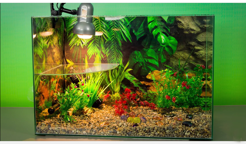 - Чтобы рептилия чередовала проживание на суше и в воде, на дне укладываются большие камни и толстые ветки.