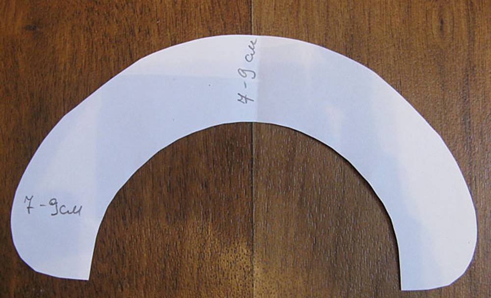 - снять 2 стандартные мерки и на их основе сделать выкройку, чтобы получился трафарет с запасом в 2,5–3 см в форме буквы «С», где величина внутренней полуокружности равна обхвату шеи, а внешней – длине шеи до кончика носа;